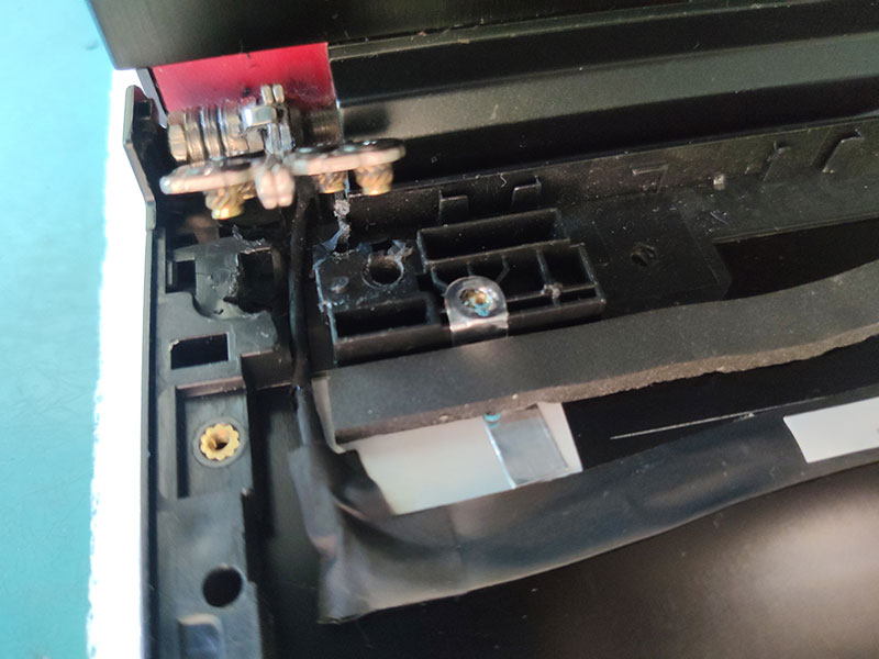 Внимание! Если произошла поломка корпуса ноутбука с заклиниванием петель крышки матрицы не пытайтесь применить силу для того, чтобы поднять/опустить крышку матрицы. В большинстве случаев в таких ситуациях происходит разрушение пистонов крепления, выход из строя матрицы и обрыв кабелей которые идут от материнской платы к матрице, WEB камере и антеннам Wi-Fi.